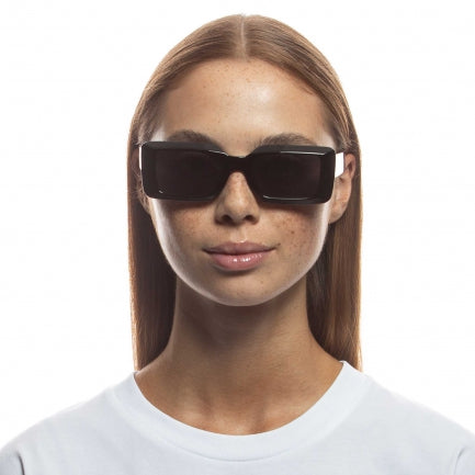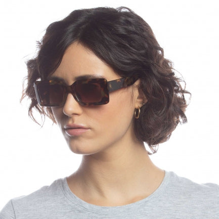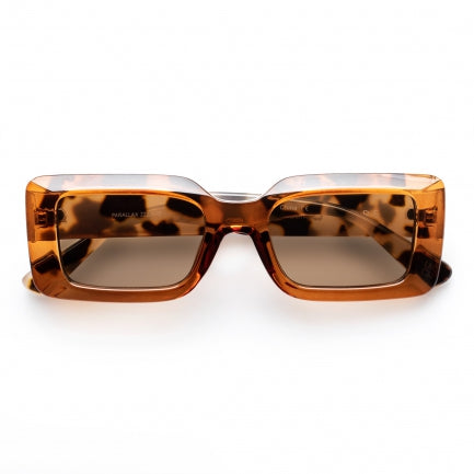 90s rectangle with bevel detailing. Medium size fit. Bold and edgy sunglasses. Crystal caramel frame with contrast cookie tortoiseshell temples featuring ochre tint lenses. AIRE foil logo detailing on both temples. Made from GRS certified recycled polycarbonate frame material. Packaged with AIRE khaki sunglass pouch made from GRS certified recycled PU.