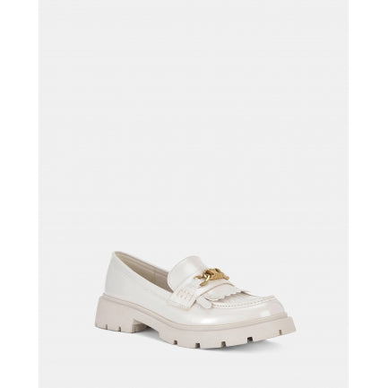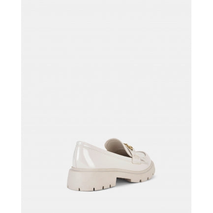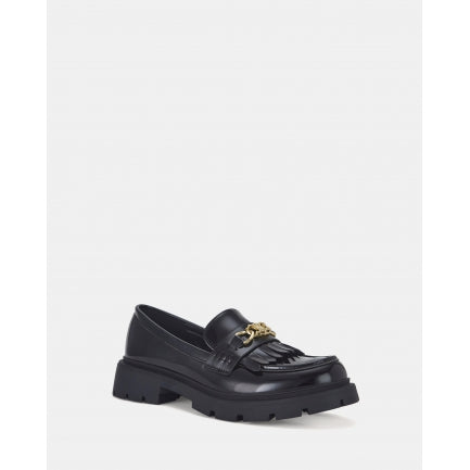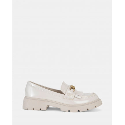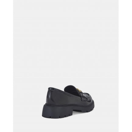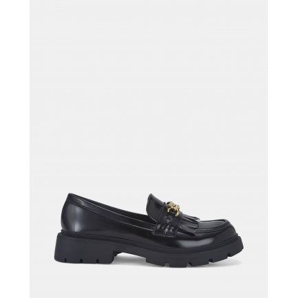 Bring back the 90’s bling with ESTIE loafers. Perfect for the modern woman who wants to stand out while remaining fashionable, this pair has an attractive gold chain detailing on the patent finish upper. Slip into these platform loafers with a pair of black linen trousers and some gold hoop earrings for a chic look.