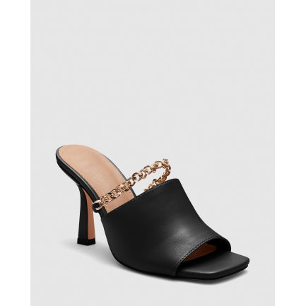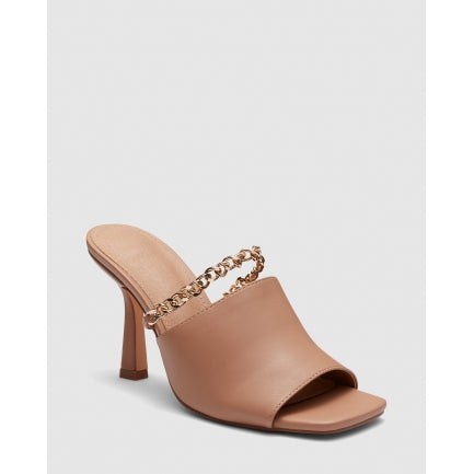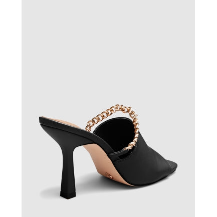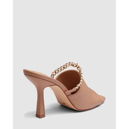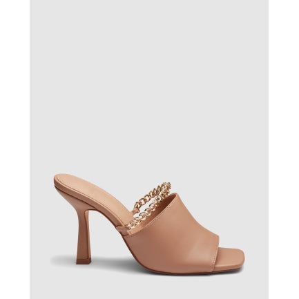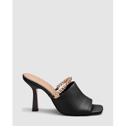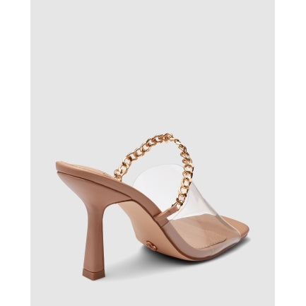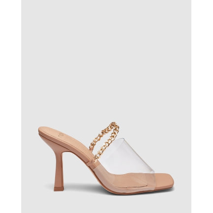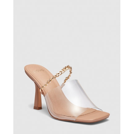A striking pair of high heels that are guaranteed to turn heads this season is here! Adorned with a fine gold chain close to the wide strap covering the vamp, FASSA slip-on mules give a beautiful glimpse of the feet. Crafted with a leather-look upper, these stellar heels are available in black and nude shades. They are also available as clear heels crafted in PVC upper.
