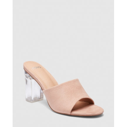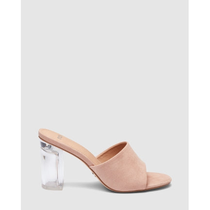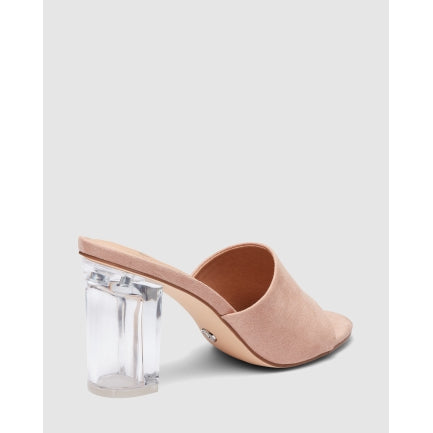 Novo Women's Ferraz Peep Toe Mules with High Perspex Heel in Microsuede or PVC