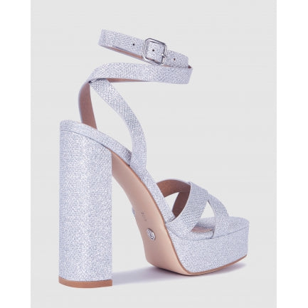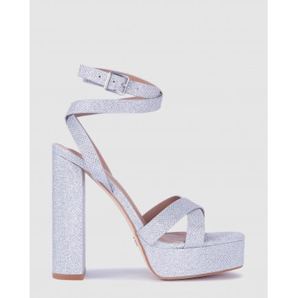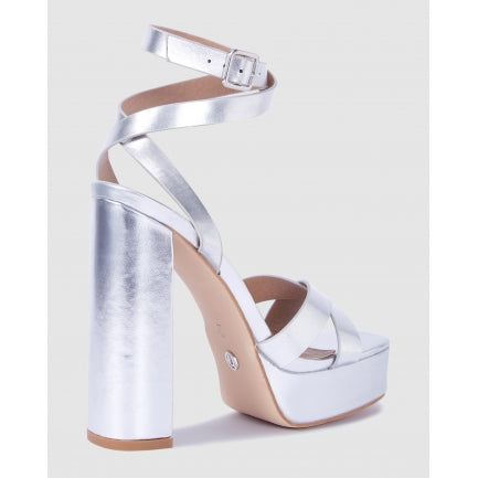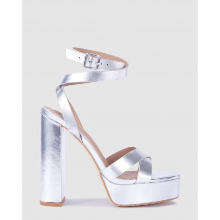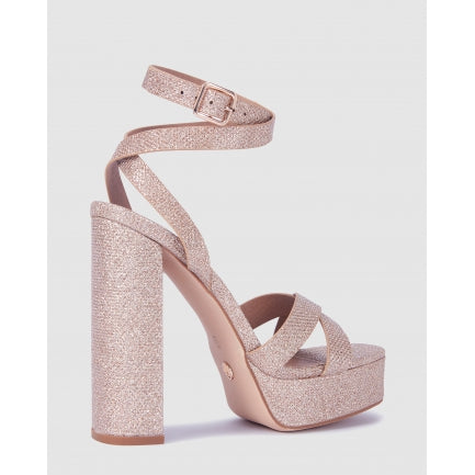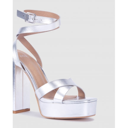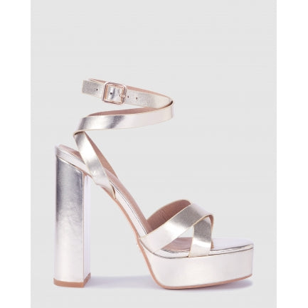 Enter like a queen! PAYTON strappy heels by NOVO are a platform rendition to complete your wedding or party look with utmost glamour. The towering block heels and raised platform along with crossed straps on the upper add drama to your ensemble. The gold and silver hues, available in lurex and leather-look finishes, have a metallic buckle around the ankle strap to complete the look.