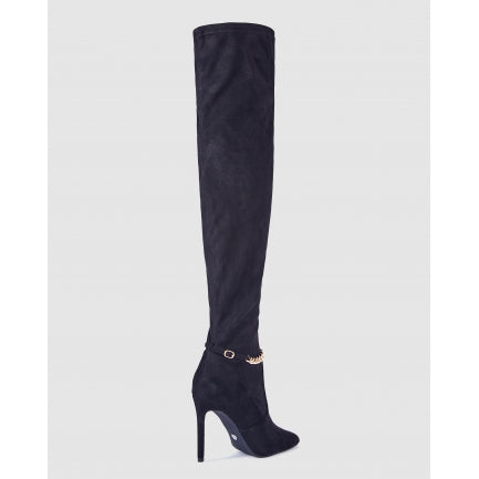 Forget glass slipper, princess likes to walk in boots! ORETTA boots create a powerful feminine profile with microsuede upper adorned with a gold chain across the ankle. These zip-up style boots with a pointed toe, sit atop elegant stilettos, making it a daring design for an instant influx of glamour.
